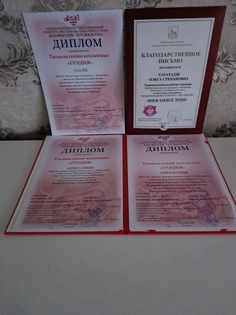 С 7 по 8 февраля 2026 года в городе Артеме состоялся международный танцевальный конкурс-фестиваль «Азия-Дэнс 2026». Танцевальная группа «Грация» из Центра детского творчества села Михайловка, руководимая Ольгой Степановной Таратадзе, стала обладателем Гран-при с номером «Варенька», лауреатом I степени с танцем «Земляничка-ягодка» и лауреатом II степени с композицией «Задорные девчата». Участниками фестиваля были коллективы из Приморья, Хабаровска, Еврейской автономной области и Китайской Народной Республики