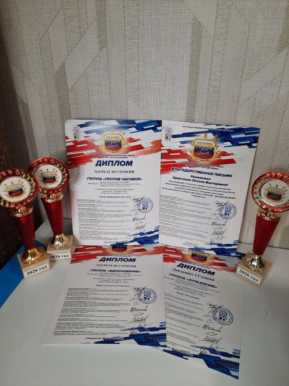 8 февраля во Владивостоке прошел Всероссийский конкурс-фестиваль «Россия — вечная Держава!». Коллектив «Позитив» под руководством Оксаны Викторовны Кравченко активно участвовал в мероприятии. Танцевальная группа «Против часовой» с номером «Когда растают все снега» получила звание Лауреата III степени. Группа «Вдохновение» с танцем «Солнце встало высоко» также была удостоена звания Лауреата III степени. Группа «Отражение» с постановкой «На горе мак» стала Дипломантом I степени.